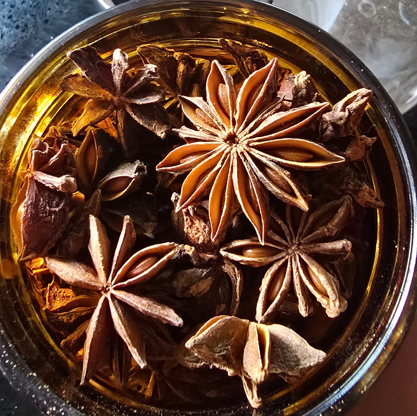 Chamomile tea boiling on the stove. I've started making it as a caffeine-free replacement for iced tea. My only regret is not buying it in bulk initially.